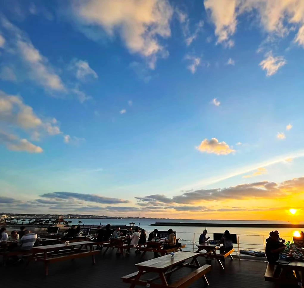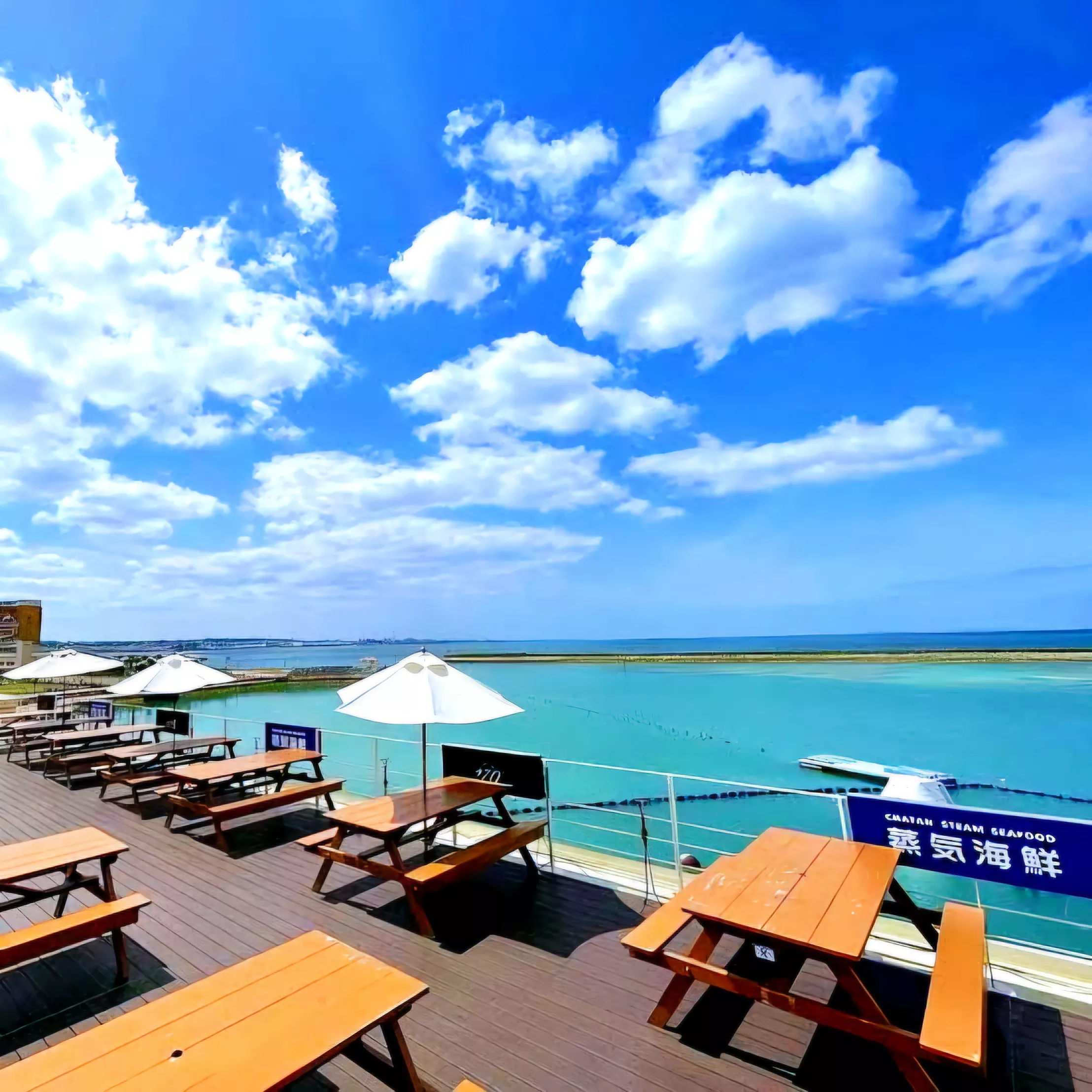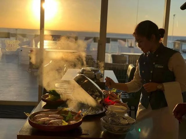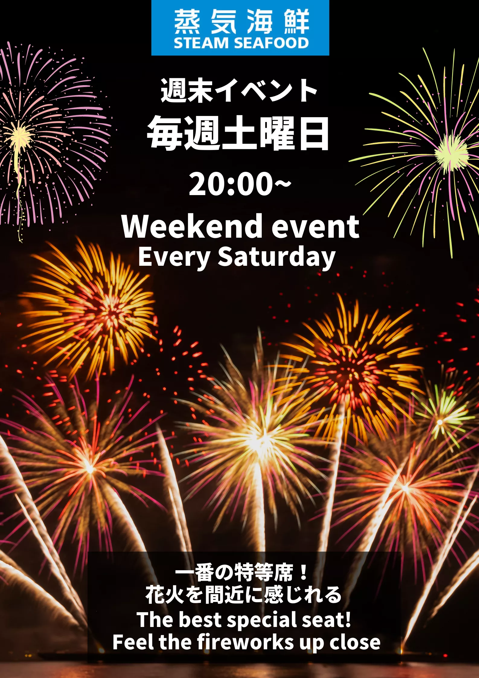 海鮮プレートはワイルドに手掴みでお楽しみ頂けます。毎週土曜日の20時は、目の前の海から花火も上がります!